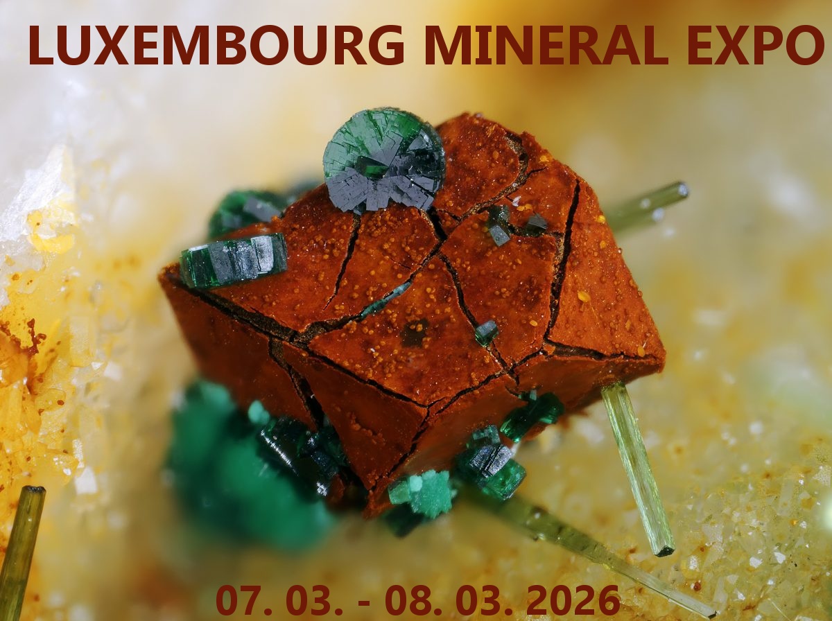 47. Mineralexpo Börse für Mineralien, Fossilien & Meteoriten; 9-18; Parc des Expositions, 120, rue Lefebvre, F-68100 Mulhouse, Autobahnausfahrt Mulhouse-Centre. V: Les Amis des Sciences de la Terre. A: H. Tischner, 18, Rue des Alpes, F-68840 Pulversheim, Tel. 0033-622-200546, E-Mail