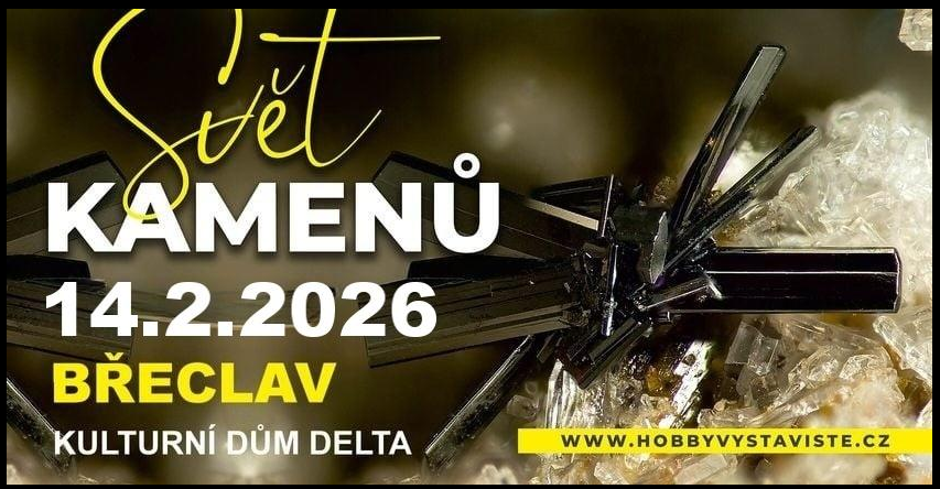 Svět kamenů. Prodejní výstava kamenů, minerálů a výrobků z nich. Kde: KD Delta Břeclav, 17. listopadu 2964/1, Břeclav 69002. Kdy: Sobota 14. 02. 2026, 9-17 hod, Vstupné: Dospělí: 80,-Kč, děti do 150 cm, ZTP/P + doprovod: ZDARMA. Pořadatel: Ing. Dan Čagánek,