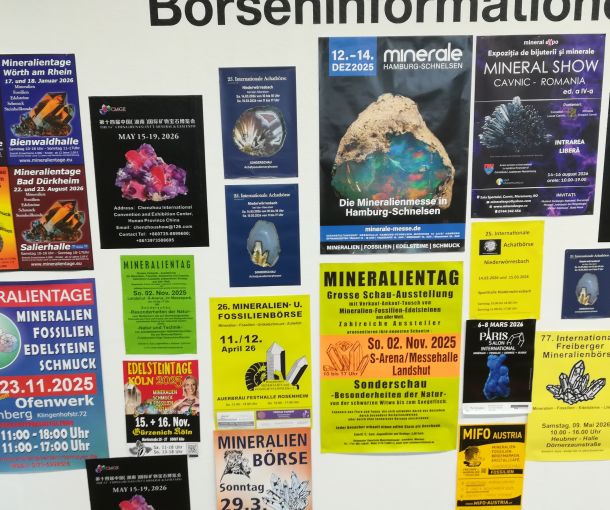 Int. Mineralienbörse; Sa 10-18, So 10-17; Babenbergerhalle, Rathausplatz 25, 3400 Klosterneuburg. V./L: L. Zanaschka, Mautgasse 3, A-2103 Langenzersdorf, Tel. +43 (0)664-4225295. E.: frei!